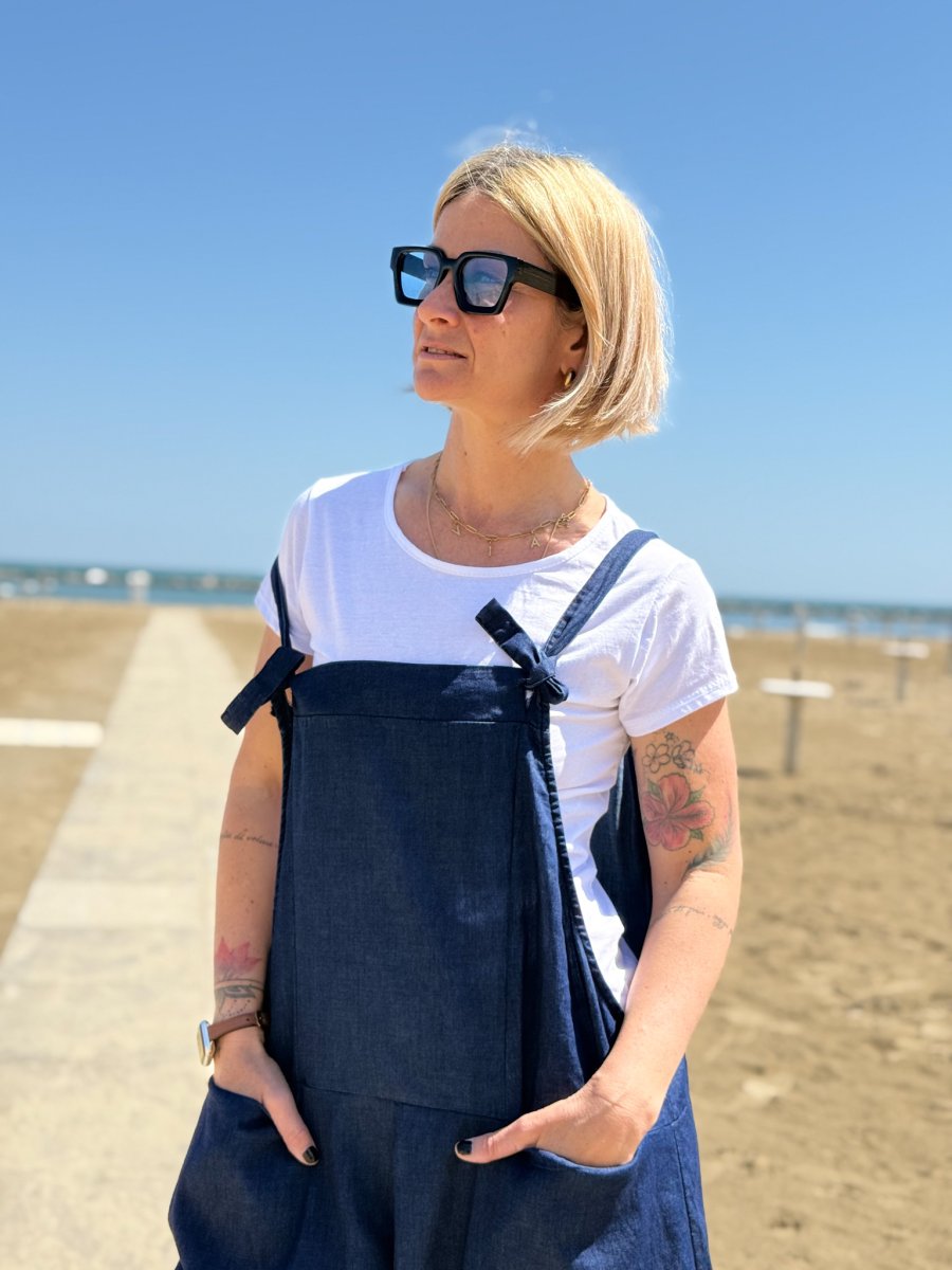 La salopette lunga ha una linea ampia e moderna, con spalline regolabili e pratiche tasche laterali, pensata per offrire massima libertà di movimento senza rinunciare allo stile. Il cotone elasticizzato garantisce una vestibilità confortevole, che si adatta a diverse fisicità grazie alla sua morbidezza e flessibilità . In abbinamento, la t-shirt bianca a maniche cortedona un tocco di essenzialità e luminosità , creando un look bilanciato, minimal ma sempre attuale.
