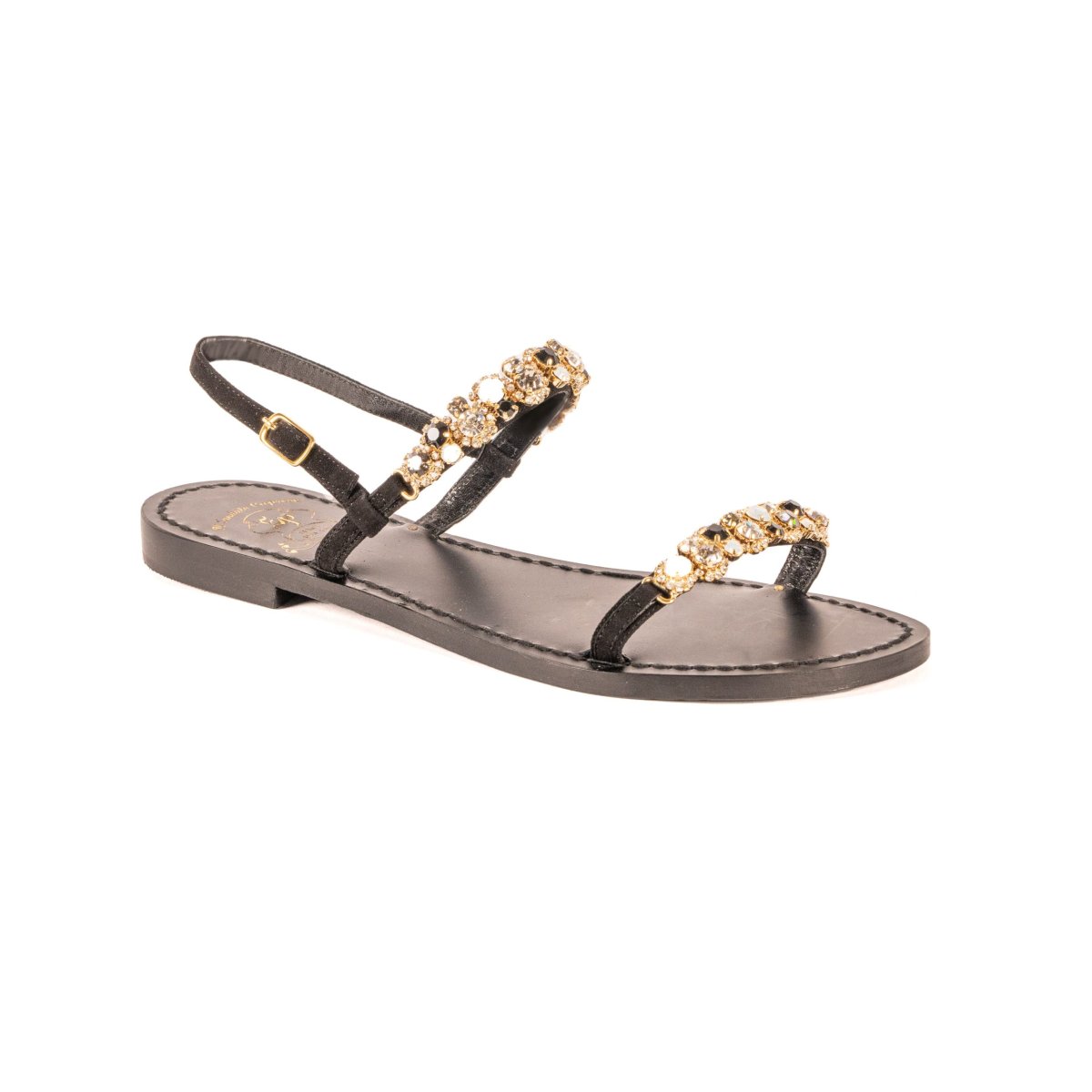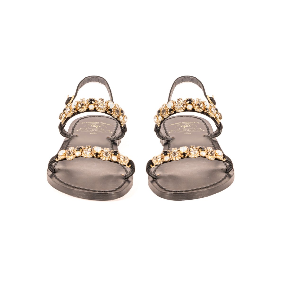 Suole realizzate in cuoio, e lacci in vera pelle, di Toscana. Applicazioni realizzate con mix di cristalli Preciosa, Swarovski, Ottone e Rame. Tutti i modelli sono realizzabili con suola classica, tacco 2,5cm (+5โฌ sul prezzo base), tacco 4cm (+10โฌ) e nera (+10โฌ sul prezzo base).