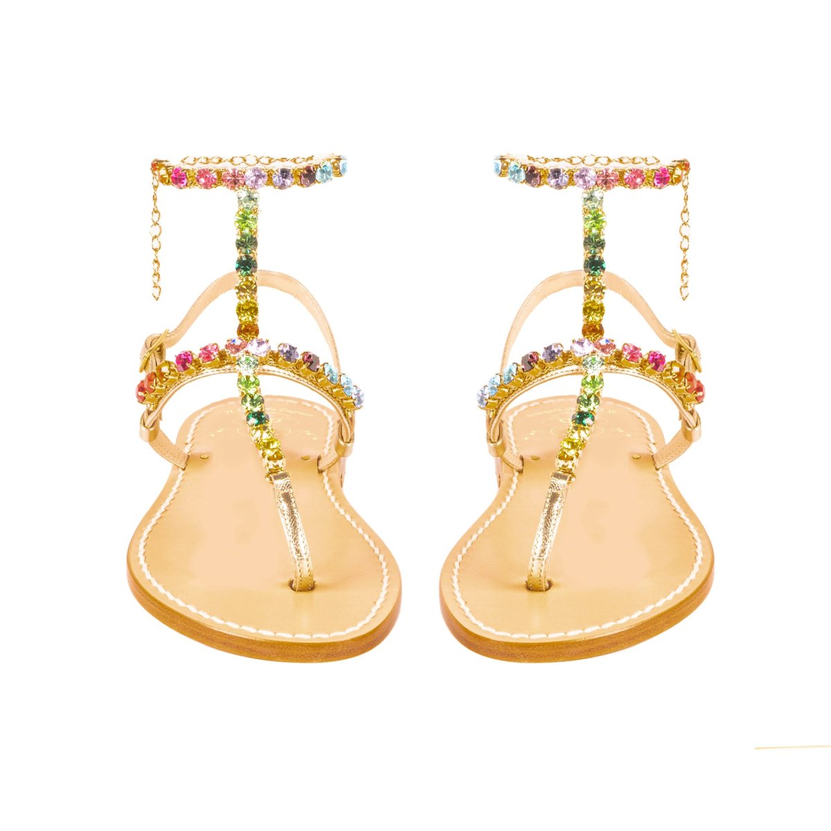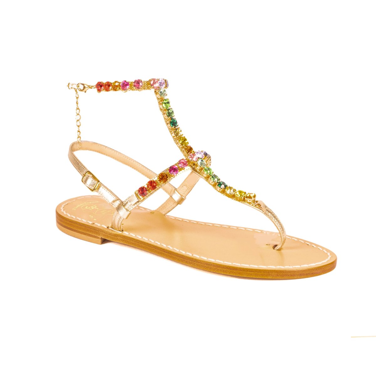 Suole realizzate in cuoio, e lacci in vera pelle, di Toscana. Applicazioni realizzate con mix di cristalli Preciosa, Swarovski, Ottone e Rame. Tutti i modelli sono realizzabili con suola classica, tacco 2,5cm (+5โฌ sul prezzo base), tacco 4cm (+10โฌ) e nera (+10โฌ sul prezzo base).