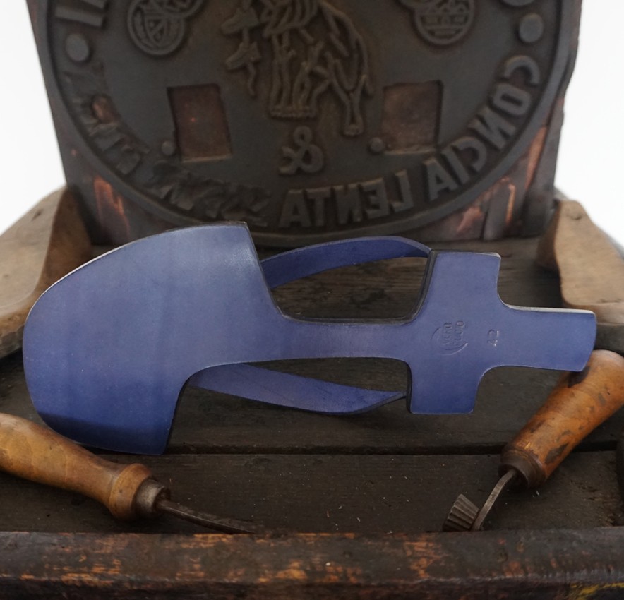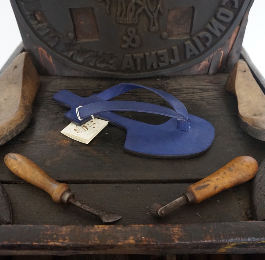 La lavorazione del sandalo inizia con il taglio del cuoio per la suola, il soletto e il tacco e il taglio della Vera pelle conciata al vegetale per il tomaio.
