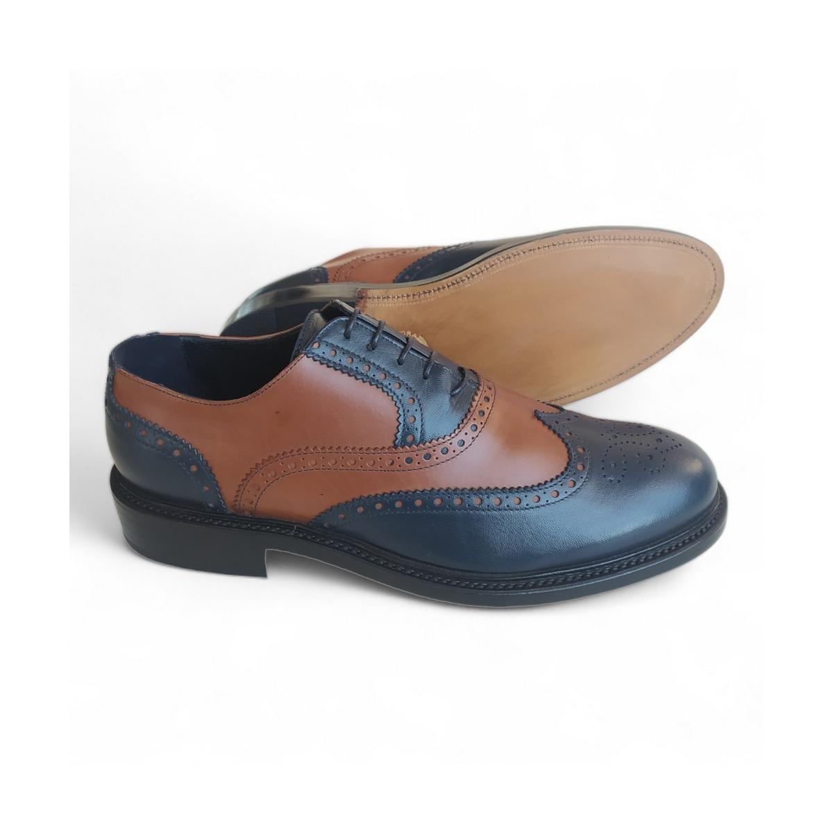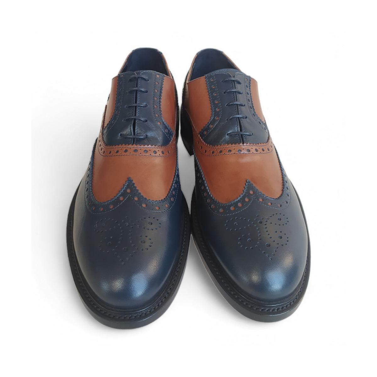 Scarpe derby uomo bicolore vintage, blu e cuoio Prodotto 100% italiano e artigianale. Qualitร dei materiali accuratamente selezionati e ottimo rapporto qualitร prezzo. Facile indossabilitร . La calzata risulta comoda data la forma importante quindi se si si tende ad avere la mezza misura su altre scarpe si consiglia un numero in meno( se si veste 41/42 scegliere 41).