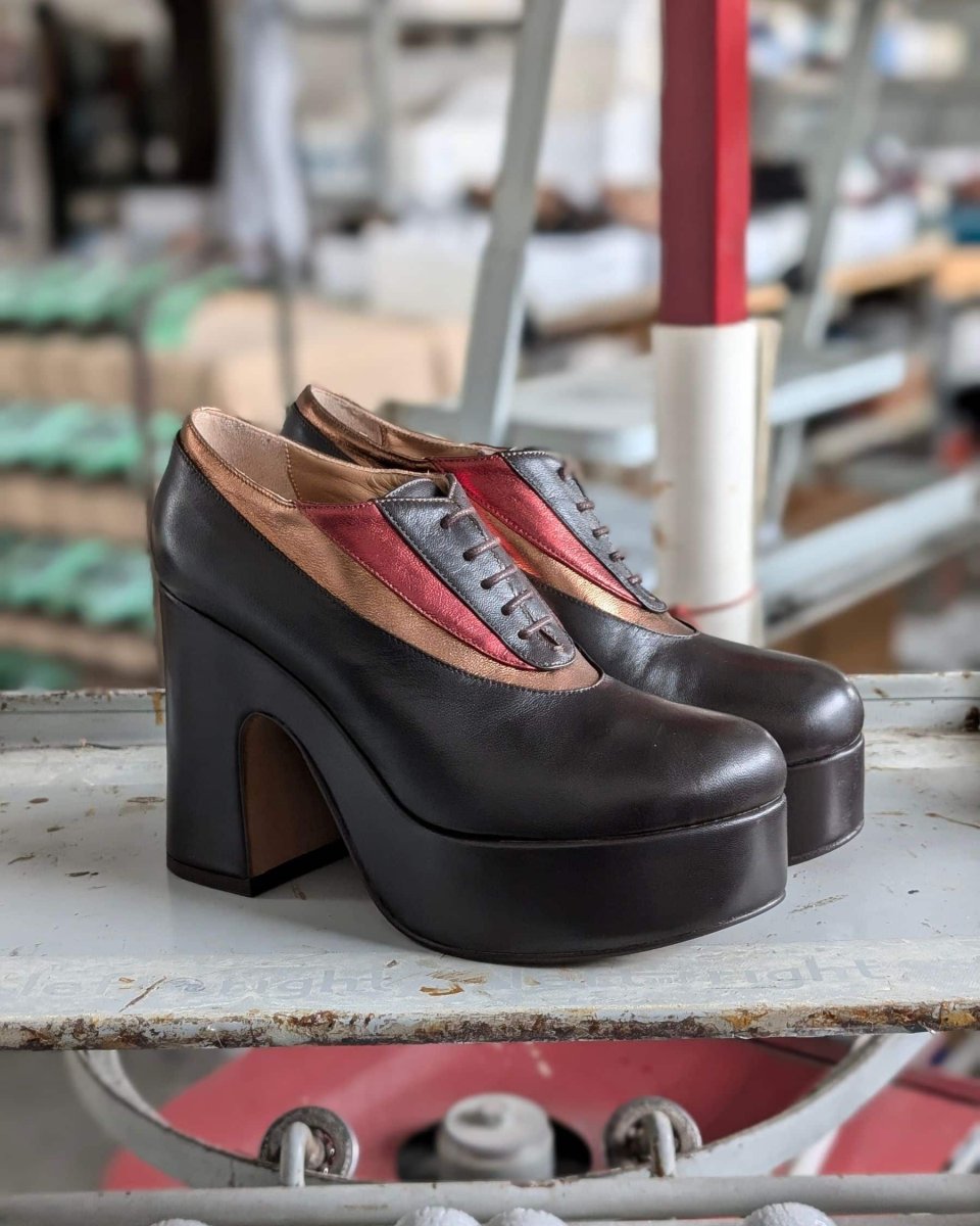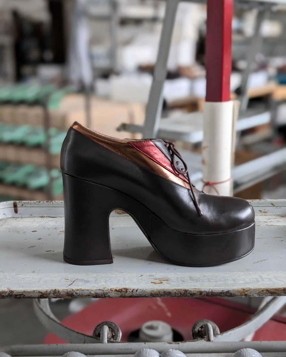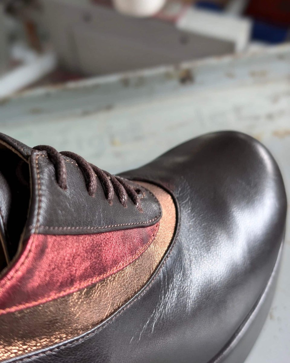 Scarpa allacciata francesina con comodo tacco a zeppa in morbida nappa testa di moro abbinata al laminato rame e bordeaux.