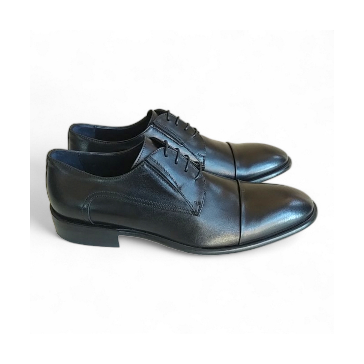 Scarpe uomo eleganti stringate stile inglese realizzate artigianalmente in pelle vitello di colore nero. La lavorazione ribattuta senza cuciture a vista le rende molto eleganti e la suola รจ a struttura singola cucita a Blake. La forma della scarpa ben arrotondata รจ fine ed elegante con la pelle di ottima qualitร finemente lavorata a mano.La fodera interna รจ in pelle di vitello e la soletta interna in cuoio lavato.