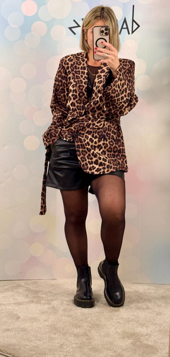 - Cintura animalier inclusa: un dettaglio accattivante che definisce il punto vita, esaltando il contrasto tra la pelle nera e il motivo leopardato.