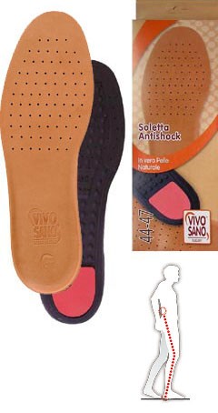 La Soletta ANTISHOCK, รจ realizzata in Vera Pelle naturale e morbido lattice e grazie all’inserto Shock Absorber posto sotto il tallone, svolge un’azione riduttiva nei confronti dei microtraumi, proteggendo la struttura ossea ed alleviando dolori e stanchezza.