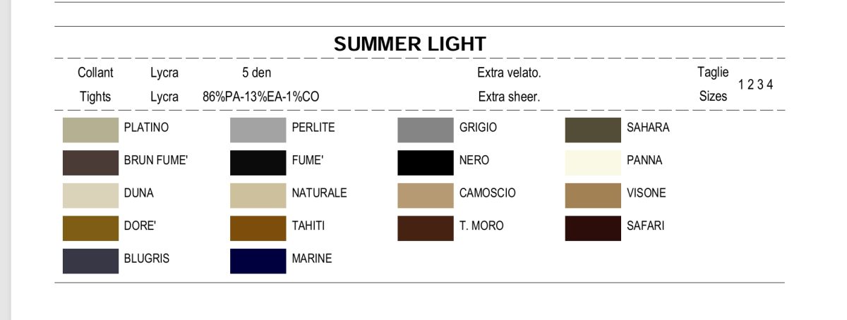 QUANTITA’ MINIMA DI ACQUISTO 3 PAIA PER COLORE E TAGLIA Summer light collant 5 den Collant estivo, assoluta trasparenza. Un invisibile soffio di freschezza sulla pelle. punta invisibile. Denari: 5 Taglie: 1 2 3 4 Composizione: 86% Nylon 13% Elastan (Lycra) 1% Cotton http://www.girardi.net ALTRI PRODOTTI NELLA CATEGORIA