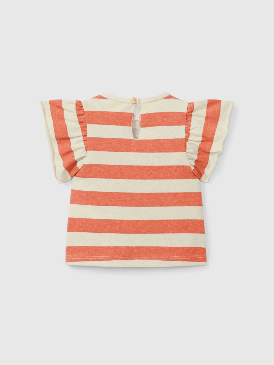 La T-shirt a righe con maniche a balze รจ realizzata in un mix di jersey di cotone e lino, garantendo traspirabilitร e comfort. Le maniche a balze aggiungono un tocco di eleganza, mentre l’apertura a goccia sul retro facilita la vestibilitร . Adatta per un look casual e raffinato.