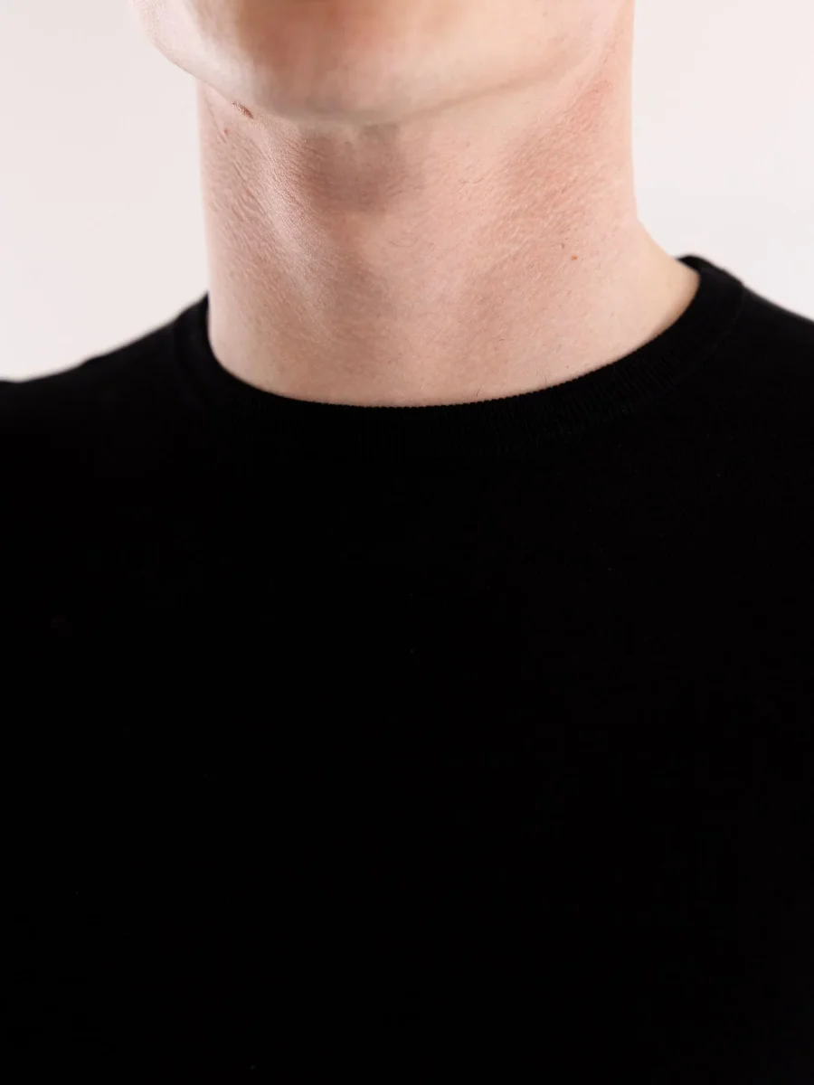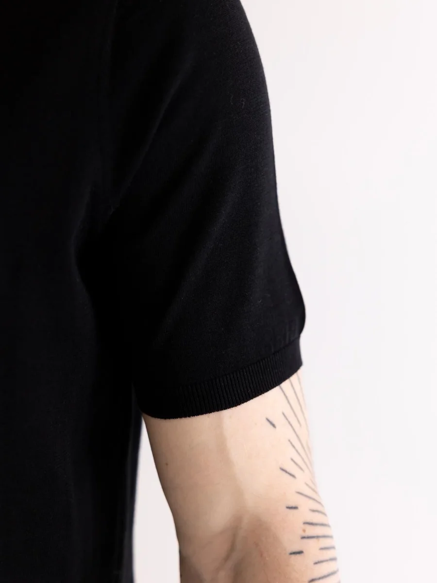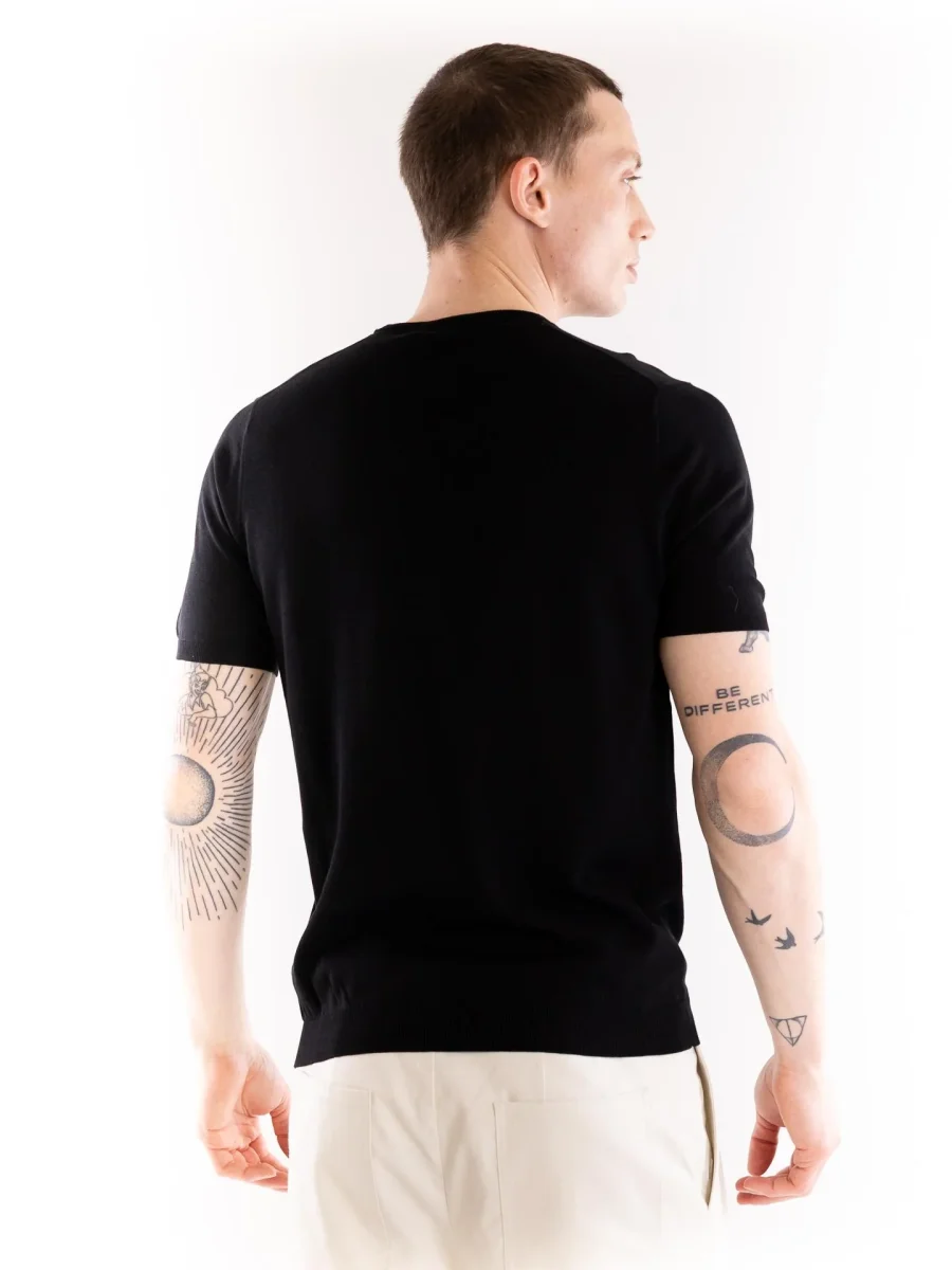 Maglia maniche corte girocollo in filo realizzata in cotone tinta unita nera. Bordo a costine su fondo e maniche e collo. Vestibilitร regolare. Composizione 85% cotone 10% seta 5% lino. Altezza modello 1,80 indossa una 50