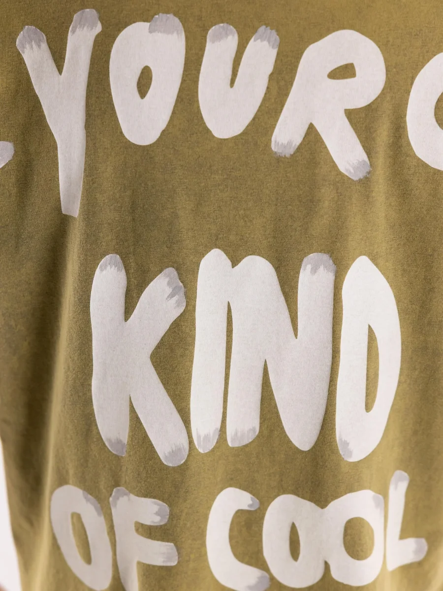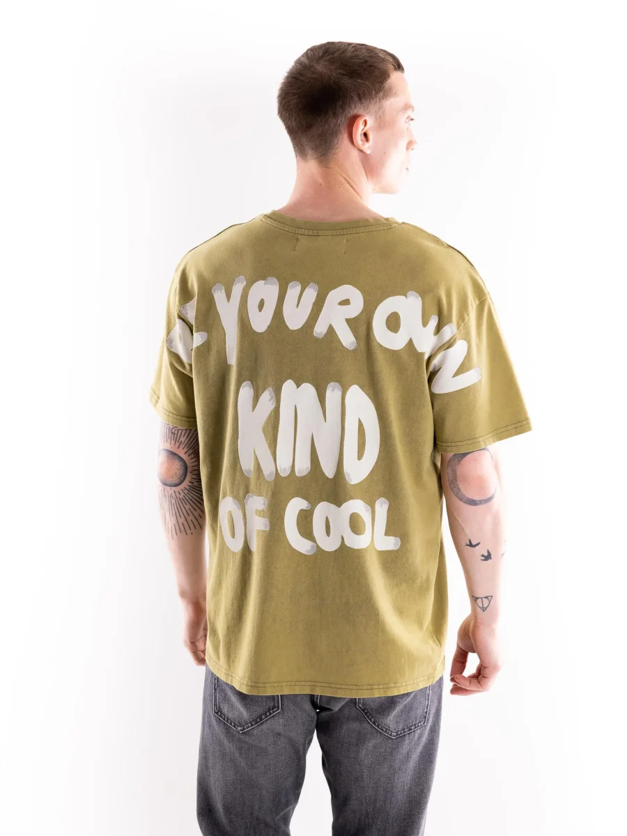 T-shirt girocollo manica corta in cotone lavato color verde militare. Dettaglio di stampa effetto murales nella schiena. Vestibilitร over. Composizione 100% cotone. Il modello รจ alto 1.80 e indossa una L
