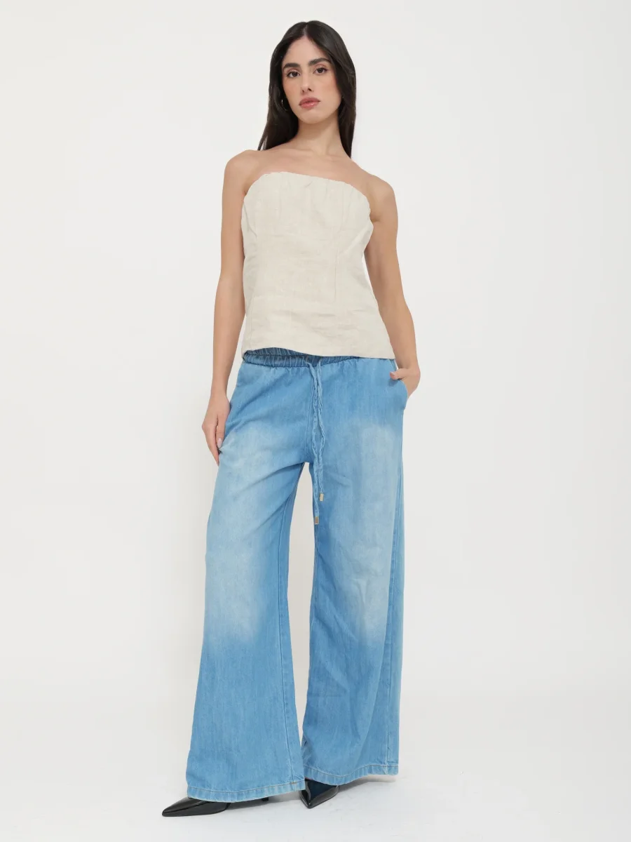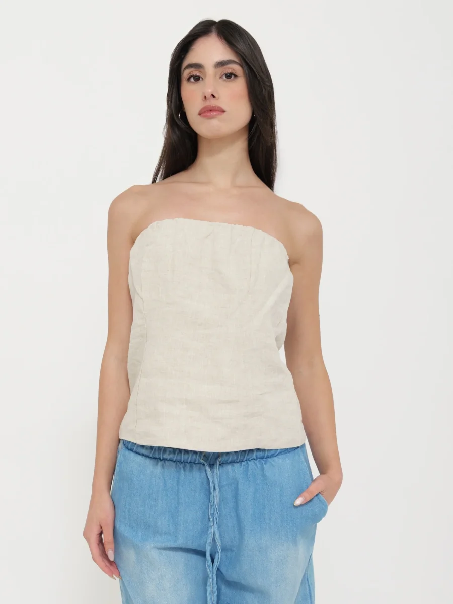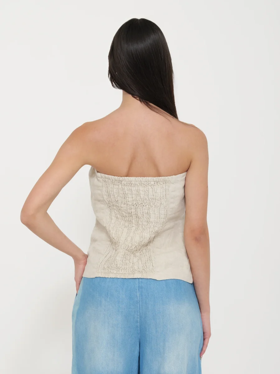 Top a fascia realizzato in lino leggero e traspirante, aderente al corpo per una silhouette elegante e naturale. Ideale per look estivi e minimalisti.