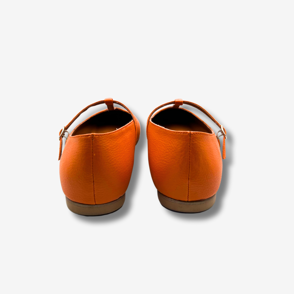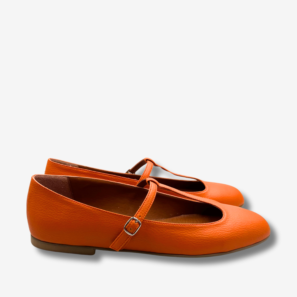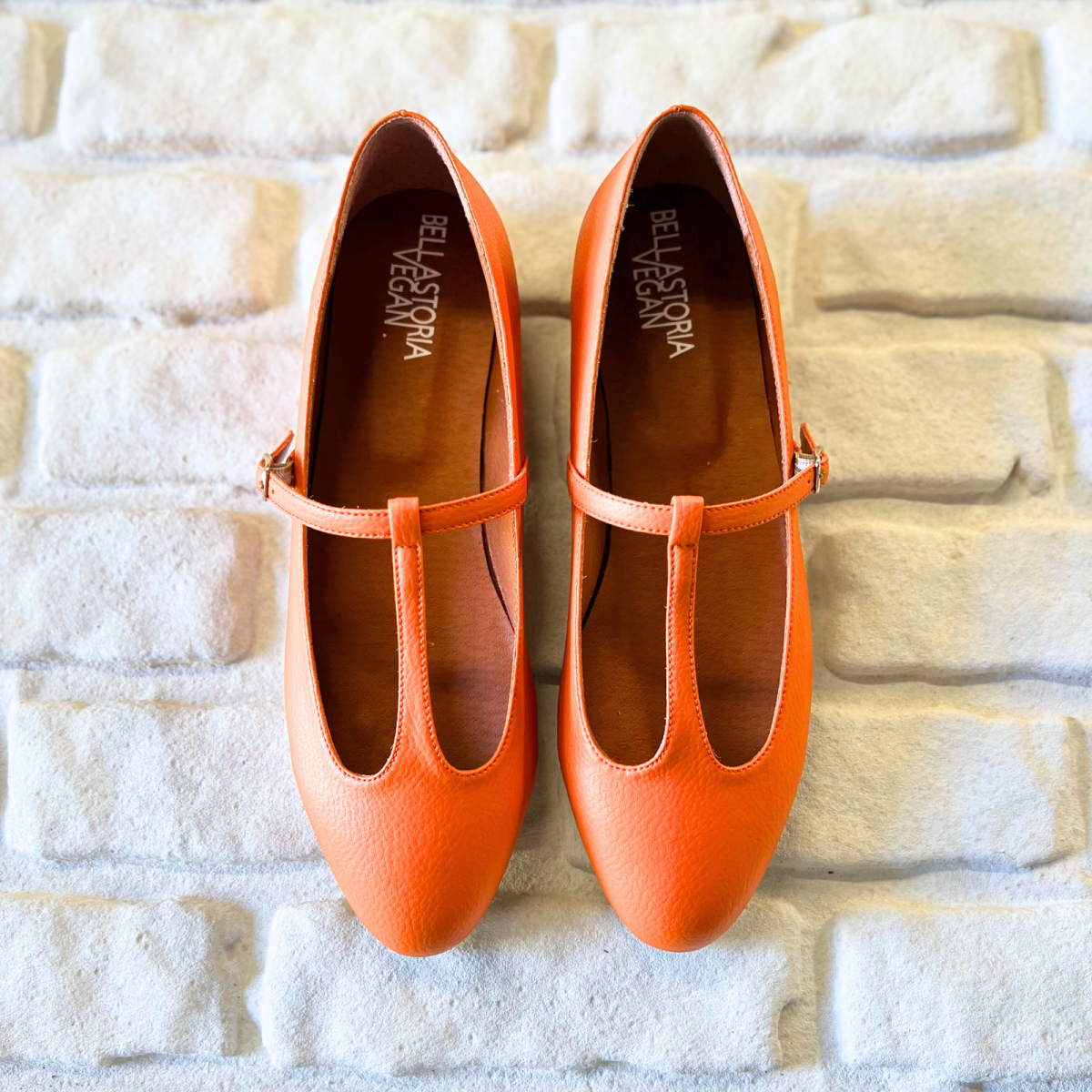 Ballerina Mary Jane Arancia & Cactus. Il connubio perfetto tra comfort e femminilitร . Una ballerina modello Mary Jane con cinturino a T Bar e fibbia color nickel (nickelfree). Tomaio in Ohoskin, realizzato con gli scarti della Vera Arancia Siciliana e foglie di Cactus, fodera in Pet riciclato, realizzato con il recupero delle bottigliette di plastica. Soletto fisso in sughero su base trattata alla clorofilla, per renderlo traspirante ed antibatterico. Tacco minimal da 10mm, altezza giusta per non essere raso terra. Provale e te ne innamorerai!