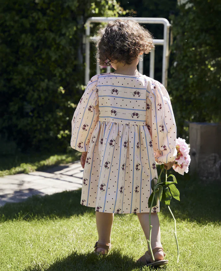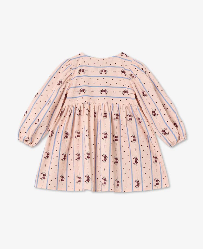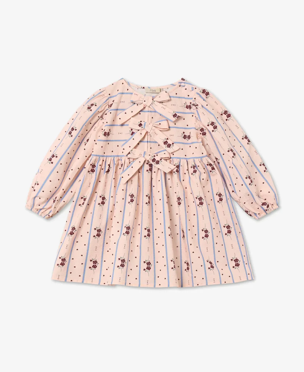 Abito in tessuto morbido per bambina con maniche lunghe e affascinante stampa che combina rose, cuori e strisce blu. Il taglio in vita crea volume generoso, garantendo comfort e libertร  di movimento. Il collo rotondo รจ arricchito da bottoni rivestiti in tessuto su una spalla, facilitando l’indossamento e la rimozione. Dettagli di fiocchi sul petto aggiungono un tocco femminile e delicato al design complessivo.