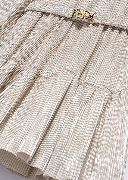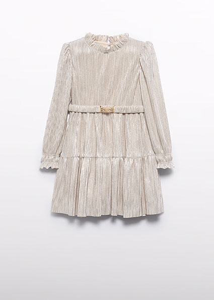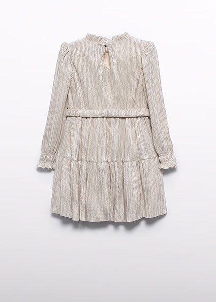 Abito in tulle glitter con trasparenza sulle maniche per bambina. Fodera interna in cotone. Manica corta plissettata. Fusciacca con fiocco alla cintura. Apertura posteriore con cerniera nascosta.