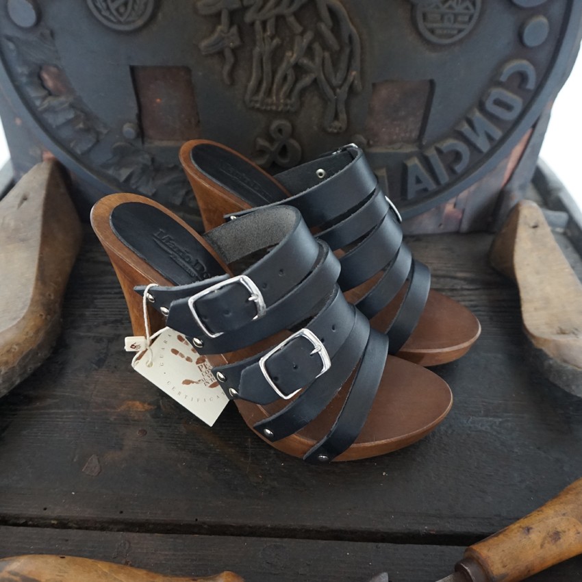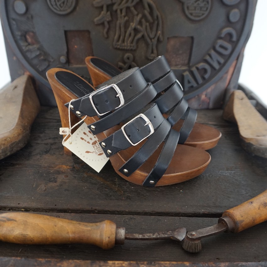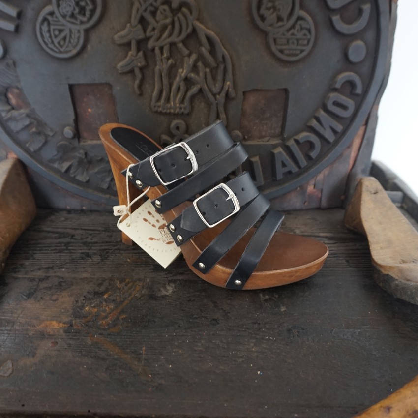 Zoccoli donna in legno e pelle – Mod. Ludovica altezza 10 cm. Zoccoli realizzati in legno nella migliore tradizione artigianale Toscana.
